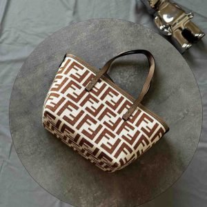 The Fendi Mini Roll Bag, crafted in jacquard fabric, introduces an iconic brown FF motifThe bag features a detachable shoulder strap, offering versatility to wear it crossbody or as a clutch.