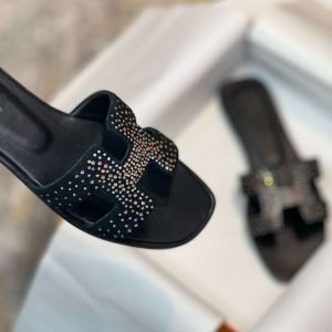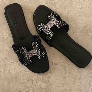 Be the first to review “Hermes Black Crystal Embellished Oran Flat Slides Sandal”